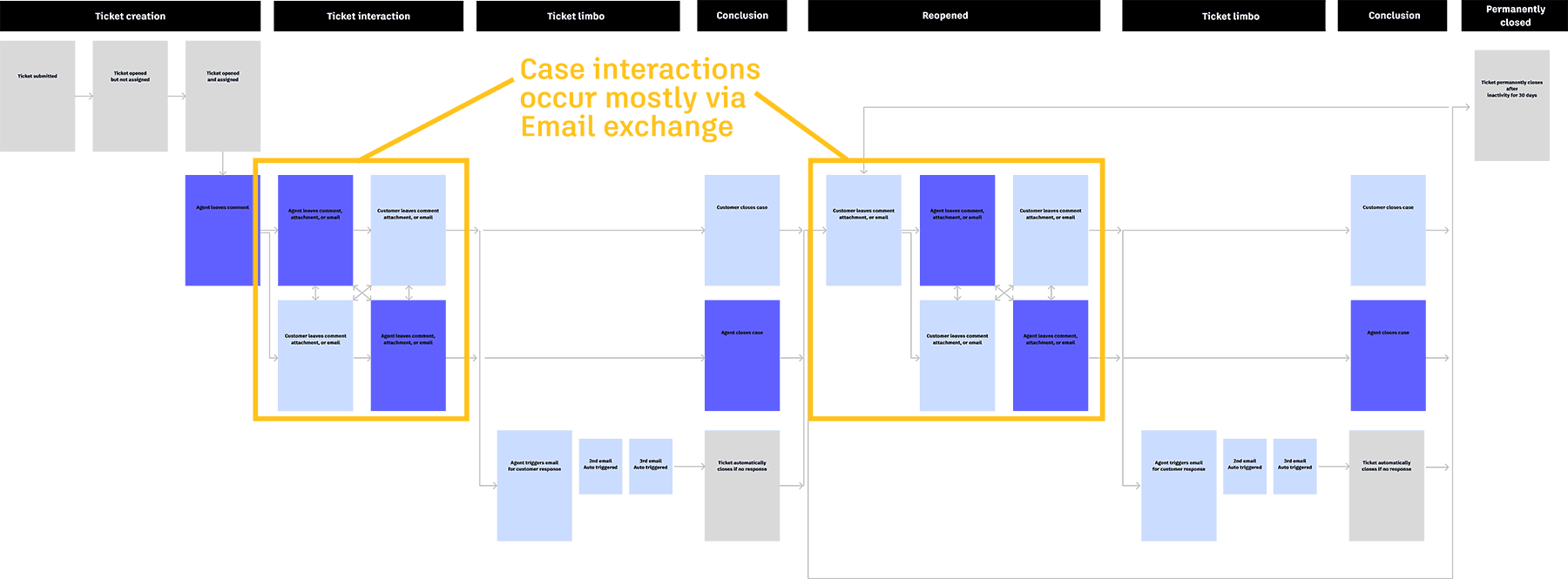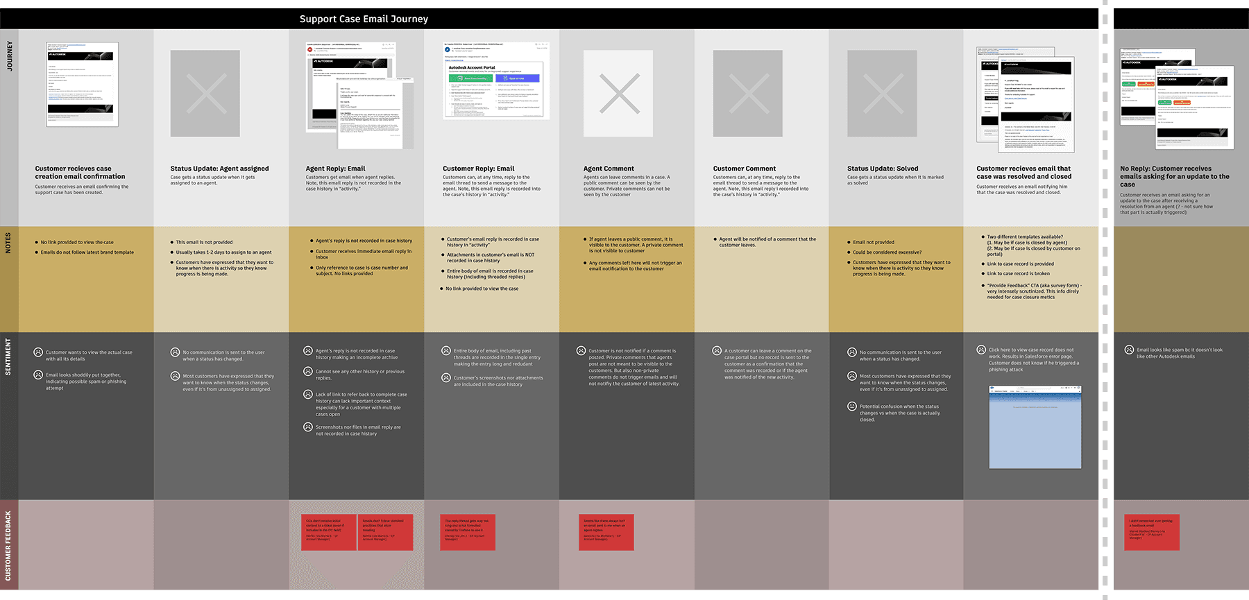I mapped each email touchpoint a customer receives during the support case lifecycle. I also captured direct customer feedback, analyzed sentiment throughout the journey, and identified gaps in expectations by benchmarking against other support email experiences.