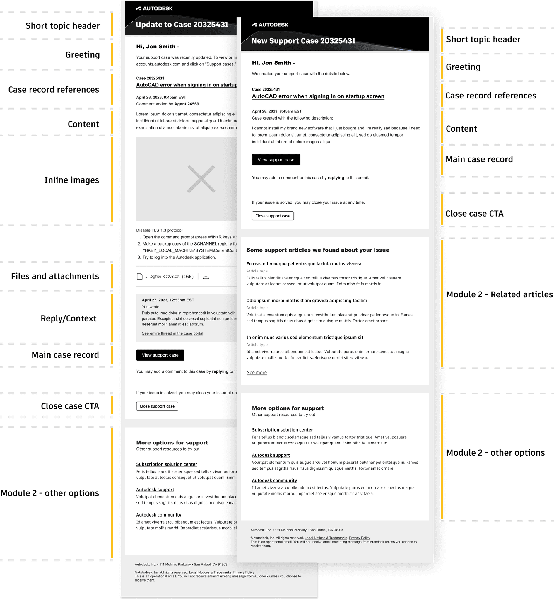 I applied Autodesk’s current email design patterns to modernize the outdated support case emails. I kept the template's modular components to enable flexible, swap-in/swap-out sections.. Added a direct link to the support case on the new web portal, enabled inline image display, including the most recent reply for context, and providing the option to close the case directly from the email.