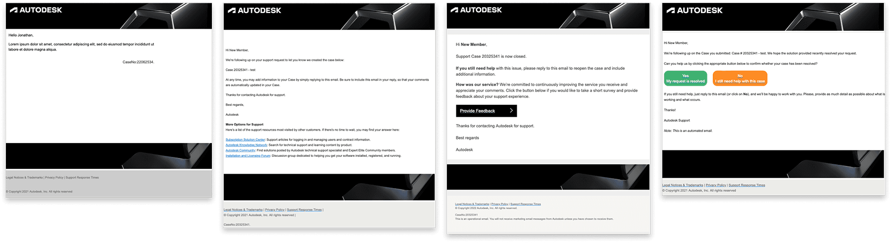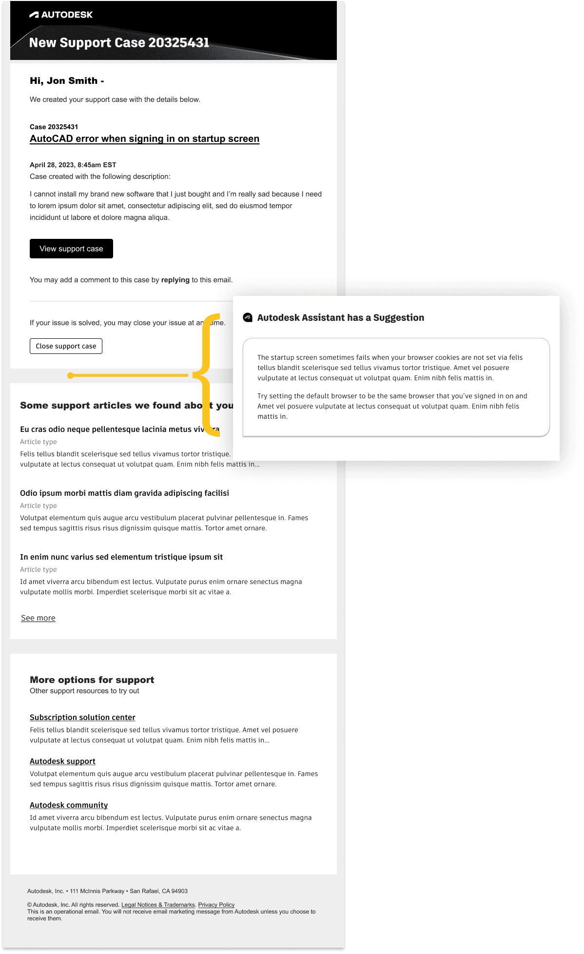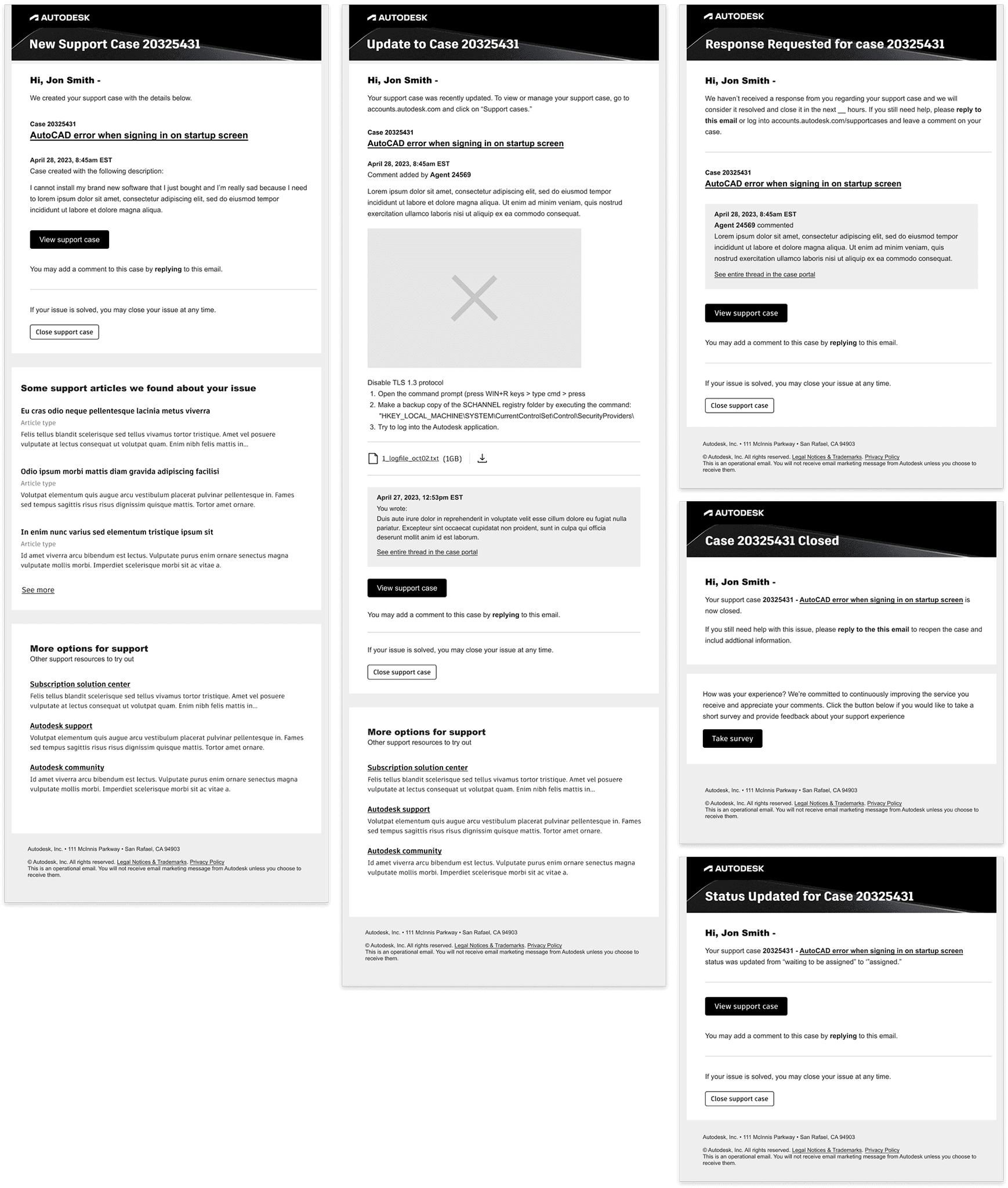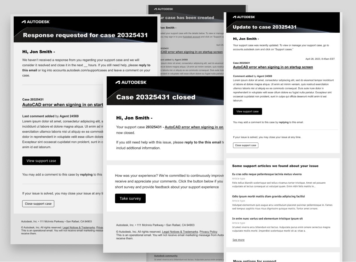 Although the email system was technically out of scope of the original project, I advocated for its inclusion. I proposed a modernization effort to bring support case emails up to the quality and consistency of Autodesk’s designs system.